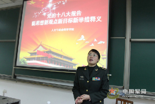 该校人文与社会科学学院的蒋均时教授为六队的全体学员进行一场精彩的政治思想教育授课。她带领全体学员从十八大报告主题入手,条分缕析地探讨了她在学习与研究十八大报告中发现的31个“新”问题,包括将科学发展观确立为党的指导思想,建设中国特色社会主义的总依据、总布局、总任务的新观点,努力建设美丽中国的新目标,实施创新驱动发展战略的新举措等等。随后,蒋教授结合我党峥嵘辉煌的发展历程,联系目前中国与世界的时局态势,生动全面地向学员们解读了十八大精神为我们描绘的鼓舞人心的美丽蓝图。授课在学员们振奋的士气与热烈的掌声中结束。
