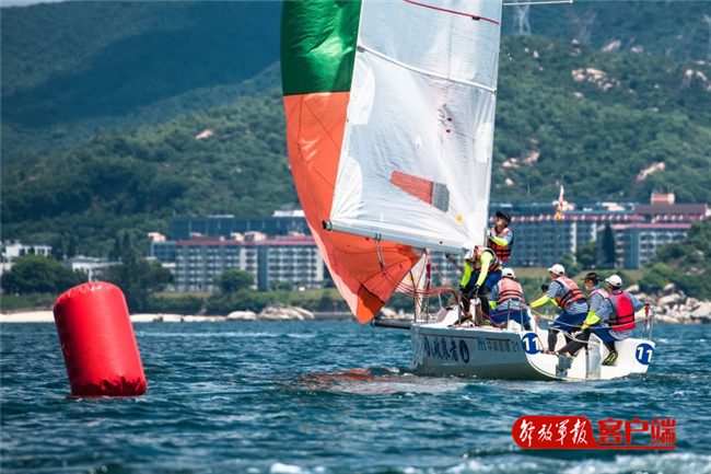 今天比赛进入第二天,风力状况比昨天更佳。尽管下午的时候风力有所减弱,只有2节,但是前4轮的最大风力有10节,在烈日炙烤之下迎风比赛,我喜欢这种感觉!经过昨晚的讨论,今天我们比赛的思路是“稳中求胜”。今天我们的比赛也很顺利,赛场表现相当夺目,无论是在航线选择还是团队配合方面,都发挥的很出色。在迎风赛段和顺风赛段,我们都以领先优势绕过标区,五轮比赛中夺得两轮第一,三轮第二,扳回了昨天与第1名六分的差距,积分榜上从第3名跃居到第1名。