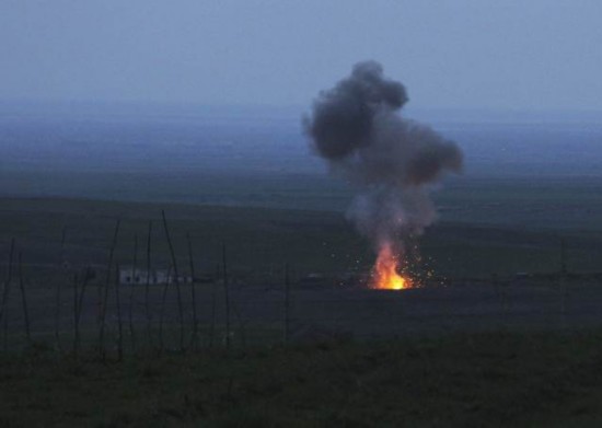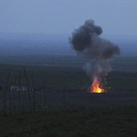 2016年4月4日,在纳卡地区,被击落的无人机冒着火光和浓烟。新华社/路透
