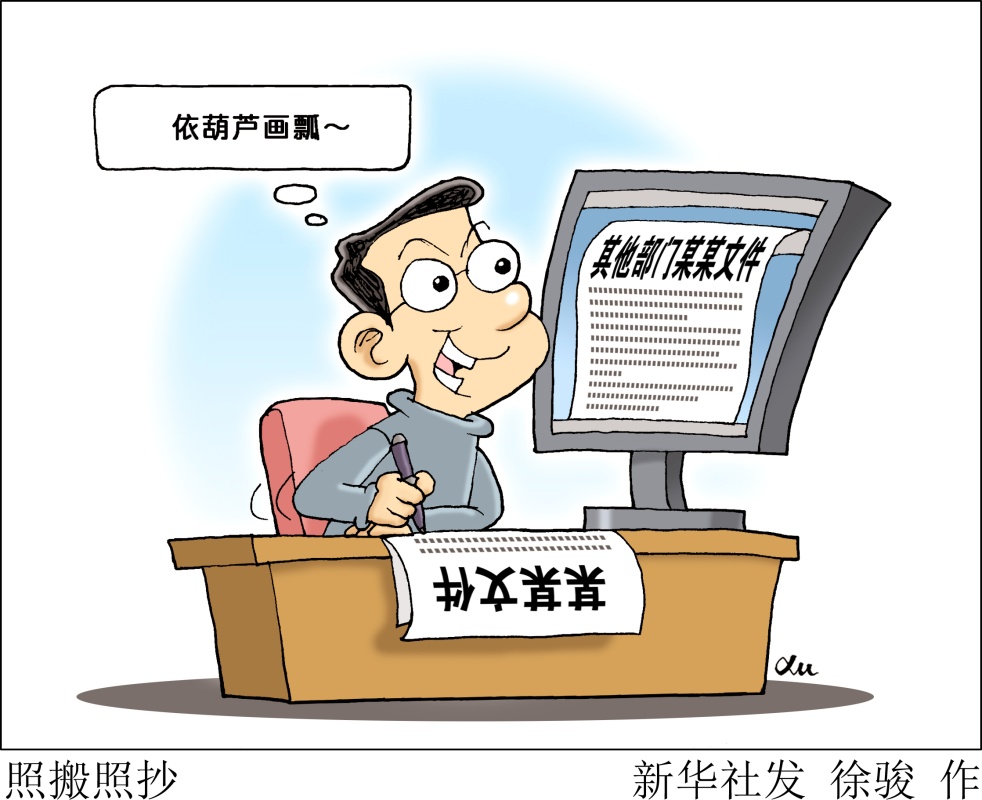 在改进文风方面,有的地方写文件、制文件机械照搬照抄,出台制度规定“依葫芦画瓢”,内容不是来自调查研究,而是源自抄袭拼凑。
