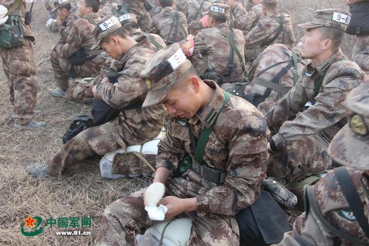 中途休息,疲倦挂在战友们的脸上。