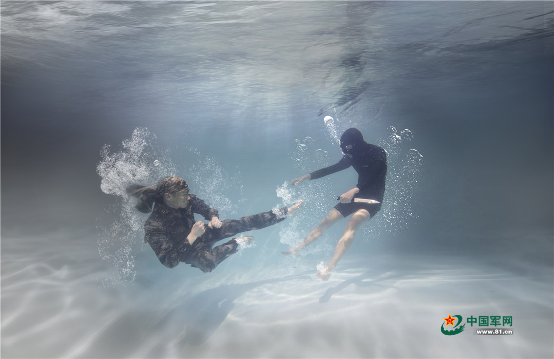 为兵哥和军嫂定制的军旅水下创意婚纱照,专门设置了故事情节哦!(图中匕首为仿真道具)