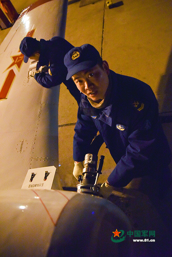 夜空中每留下一道光影,总能在停机坪上找到与之对应的手电筒灯光。在战鹰机腹底下或是输油管的末端,机务战线上的将士们用“极端负责,精心维修”的职责担当铸造了一双双承重的肩膀。