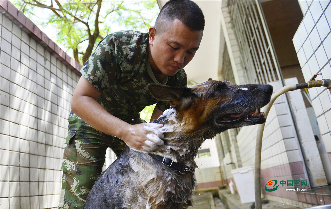 训导员袁志锋正在为警犬洗澡。