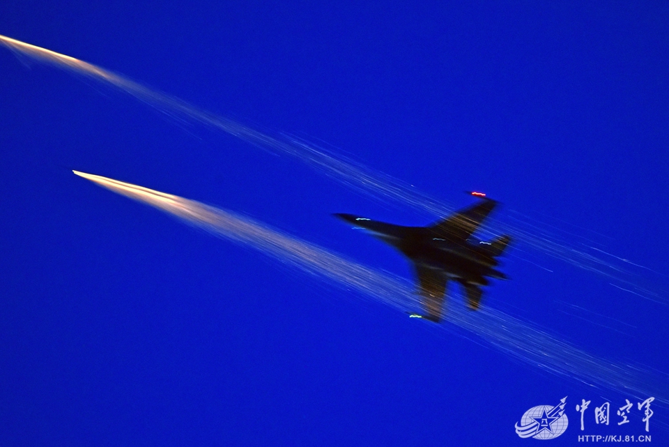 风驰电掣般,战机伸展双翼呼啸着刺向戈壁靶场,拉升、俯冲、瞄准,数枚航箭弹顺着机翼“嗖”地射向地面目标。电光石火般,黛蓝色的天幕上,火星飞溅,“滋滋滋”刻下两束金灿灿的弹轨……冷暖色彩骤然相遇,引爆了无可比拟的视觉冲击力。