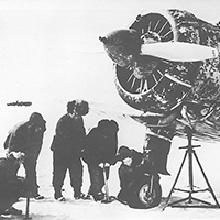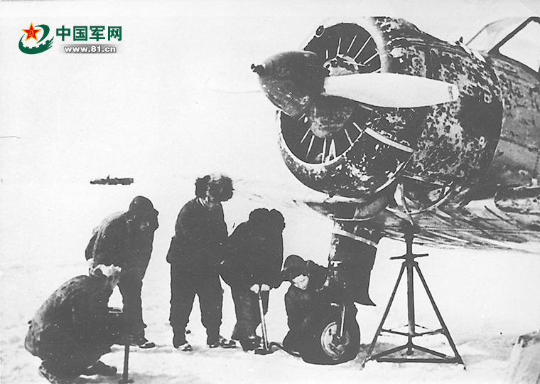 图为东北老航校机务人员用自行车打气筒给飞机轮胎打气。