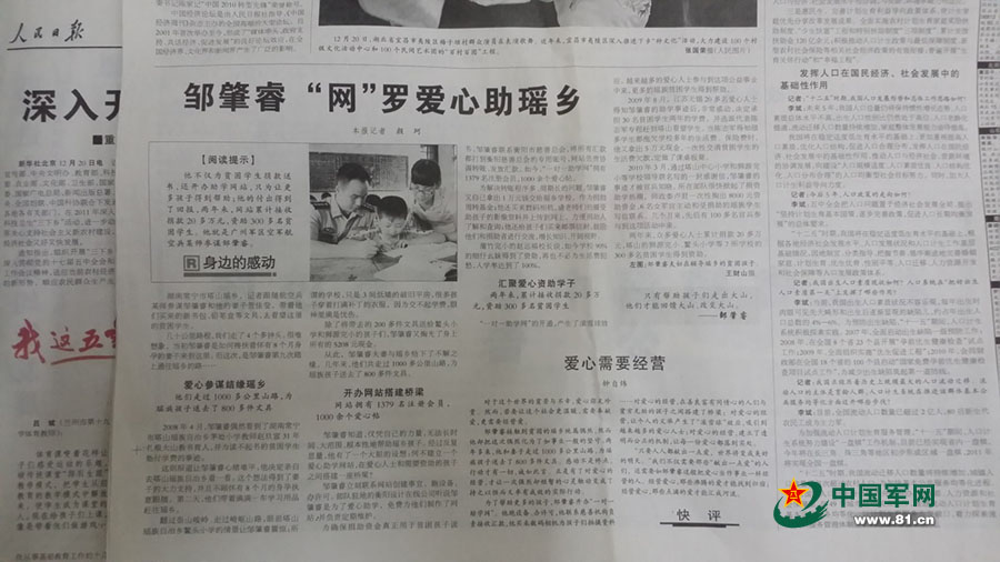 2010年12月21,《人民日报》对邹肇睿事迹的报道。