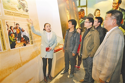 焦裕禄纪念馆讲解员(左一)向观众讲述焦书记与群众拉家常的故事。江同山摄