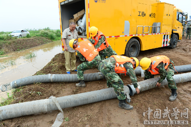 武警水电七支队战士架设排洪设备。