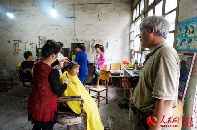 图为省摄协副主席国家金像奖得主宋刚明(右一)在拍老理发店时的情景。