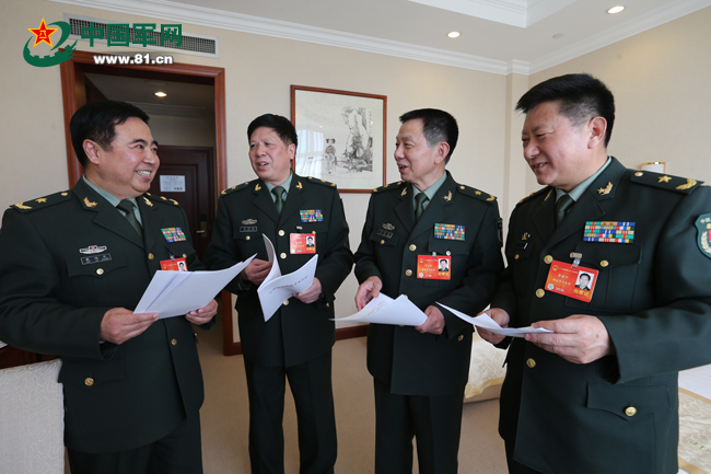 3月5日,解放军代表团分组审议政府工作报告。图为军队人大代表(从左至右)戴旭光、高尚国、刘从良、李爱平在一起,就全面深化改革,牢牢抓住发展重要战略机遇期展开热议。解放军报记者 张雷摄