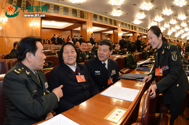 已经连任12届的申纪兰代表向解放军代表讲述历届两会的变化。解放军报记者 冯凯旋摄