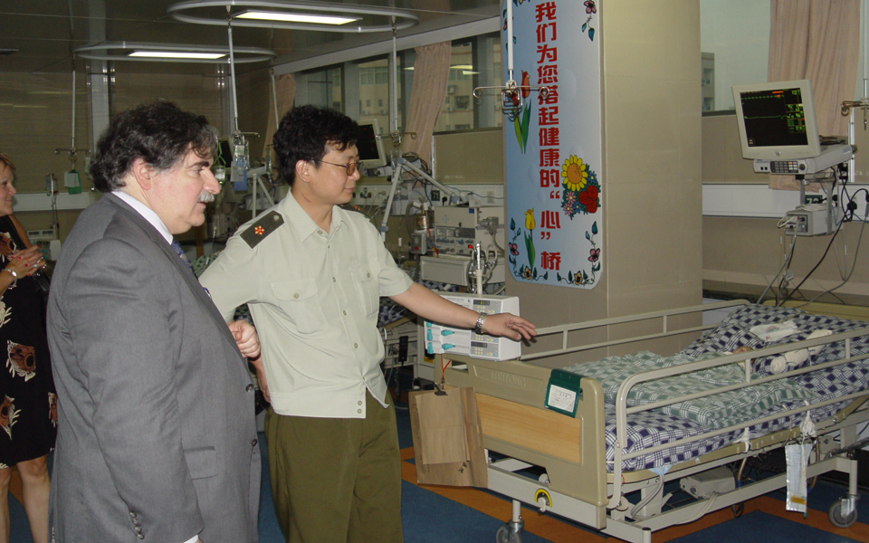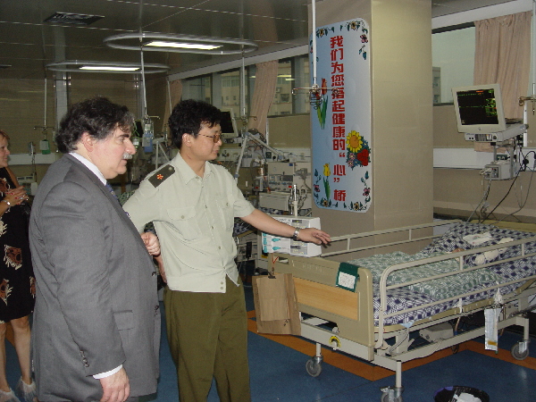 2005年,肖颖彬教授陪同美国哈佛大学医学院麻省总院盖斯教授参观心外科监护室,对肖颖彬及其团队赞誉有加。摄影范忠武