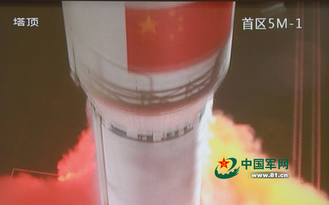 10月24日,在北京航天飞行控制中心,监控屏上显示的长征三号丙运载火箭发射升空瞬间。记者姚远摄