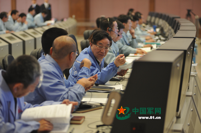 10月24日,在北京航天飞行控制中心,调度指挥人员在执行探月工程三期再入返回飞行试验器测控任务。记者彭丹摄