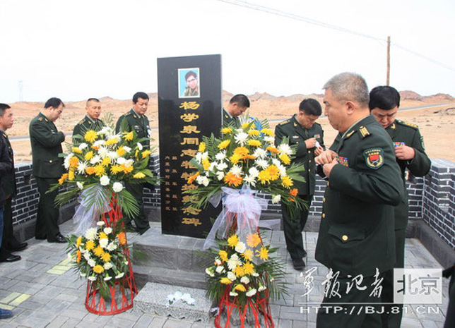 大漠边关春风晚,清明思友泪潸然。清明前夕,解放军报社的记者们赶赴内蒙古阿拉善戈壁,与戍边官兵们一起,祭奠21年前牺牲在“天上无飞鸟,地上不长草”的戈壁边陲的军报记者杨学泉同志,并举行边防官兵为杨学泉专立的纪念碑揭碑仪式