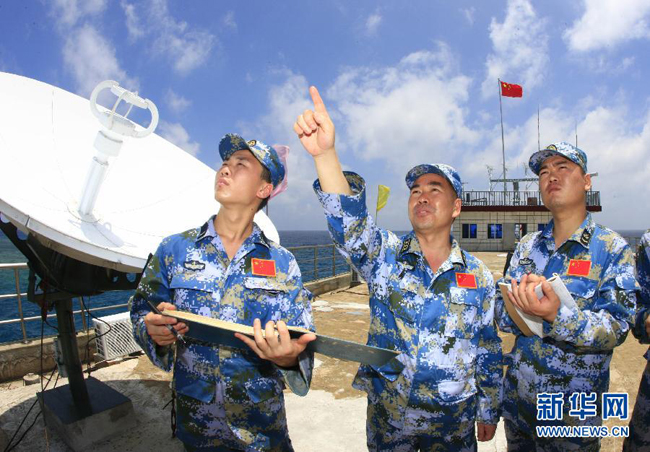 李文波(中)带领气象分队战士在永暑礁上观察记录天空云量(2010年4月3日摄)。