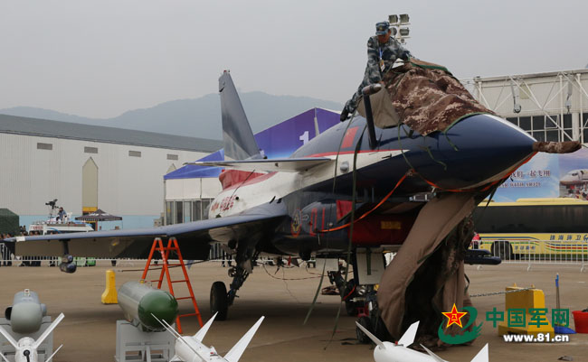 11月11日,工作人员在珠海航展开幕前撤掉盖在战机上的迷彩帆布,为静态展示做准备。张雪鸿