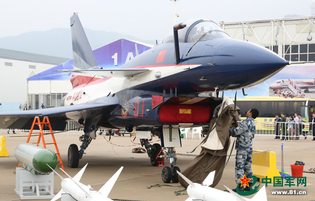 11月11日,工作人员在珠海航展开幕前撤掉盖在战机上的迷彩帆布,为静态展示做准备。张雪鸿 摄
