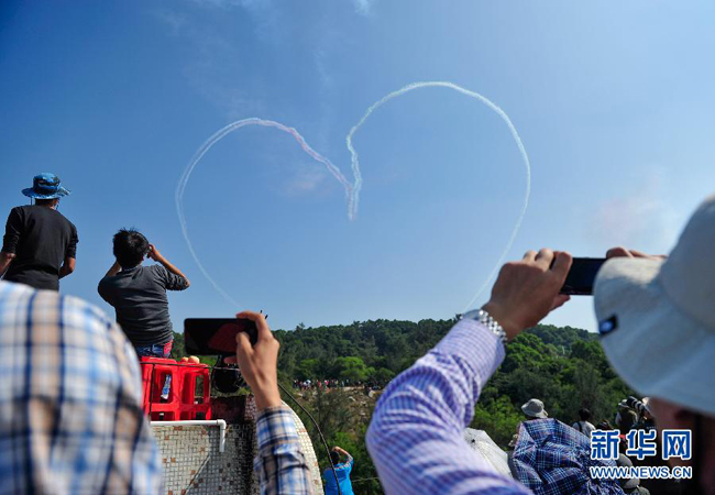 11月15日,阿联酋“骑士”飞行表演队在空中画出心形。当日,珠海金湾机场迎来久违的蓝天,参加第十届中国国际航空航天博览会的各国飞行表演队纷纷振翅比翼,在蓝天上抒写美丽篇章。由于珠海空气中含水量较高,而飞机在表演时由于常有大迎角机动动作,导致气流剥离翼面形成翼面附近的真空状态,气温骤降,空气中的水蒸气凝结为雾,所以经常可以看到飞机机翼或翼梢带着美丽的白色水雾,形如飞机的另一双翅膀。新华社记者 杨光 摄
