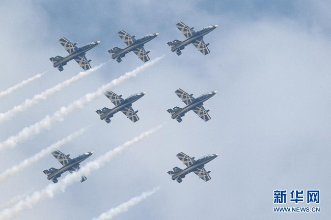 11月11日,阿联酋“骑士”飞行表演队做编队飞行。当日,阿联酋“骑士”飞行队在珠海航展开幕式上表演,这是他们第一次在中国进行飞行表演。阿联酋骑士飞行表演队成立于2010年。2010年7月,8位阿联酋空军的战斗机飞行员前往意大利瑞摩特空军基地培训,并在2011年11月13日,在迪拜航展首日进行了第一次公开特技飞行展示。骑士队使用意大利马基公司生产的MB-339轻型教练/攻击机。通常使用6架Aermacchi MB-339进行表演,第7架作为备份机。座机的涂装主要是金色和黑色。金色代表阿联酋的沙漠,黑色代表沙漠之下的石油。飞机垂尾是以金色为主的鹰翼图案,两侧机翼下表面为阿联酋国旗图案。新华社发 王强摄