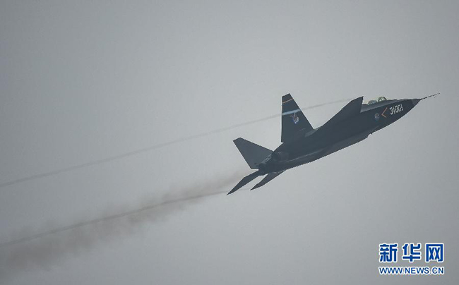 11月11日,歼-31战斗机在珠海航展中心上空进行飞行表演。被称为“鹘鹰”的歼-31是中国航空工业集团公司沈阳飞机工业集团公司研制的第四代双发中型隐形战斗机,在第十届中国航展首次亮相。新华社记者 刘大伟 摄