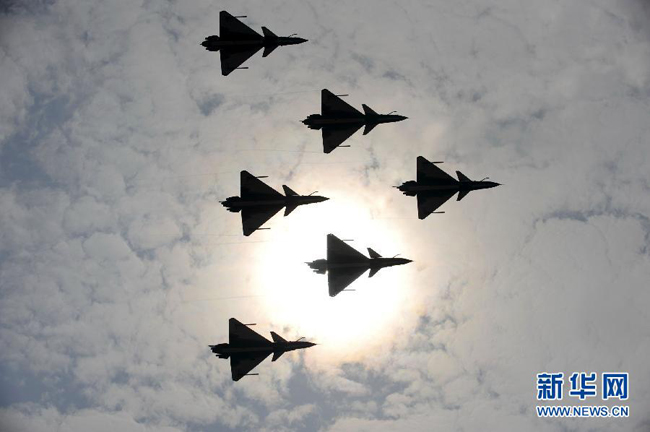 11月11日,中国空军八一飞行表演队驾驶歼-10进行飞行表演。 新华社记者 梁旭 摄