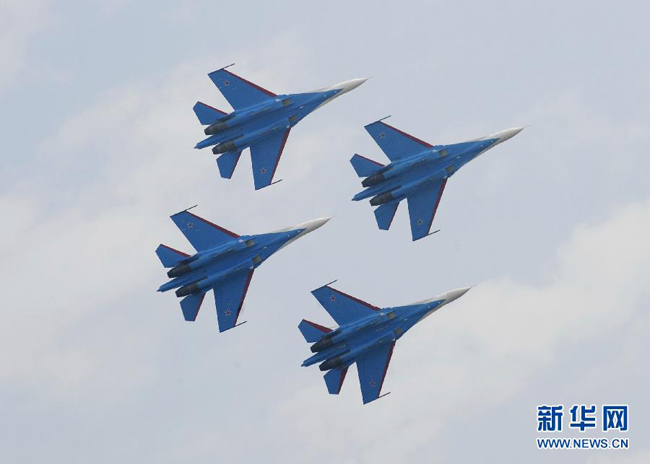 11月12日,参加第十届中国国际航空航天博览会的俄罗斯“勇士”飞行表演队驾苏-27战斗机进行了精彩的飞行表演。 新华社记者 梁旭 摄