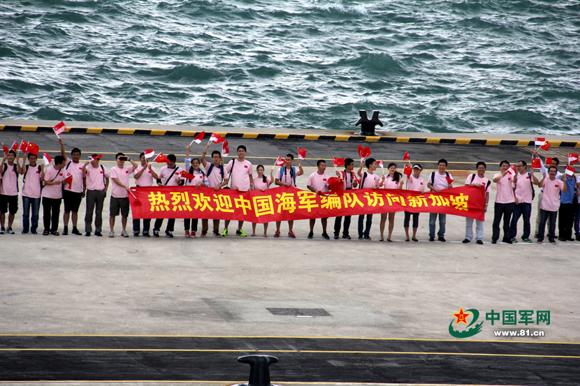 中国驻新加坡大使馆代办及留学生代表在樟宜港迎接玉林舰的到来。