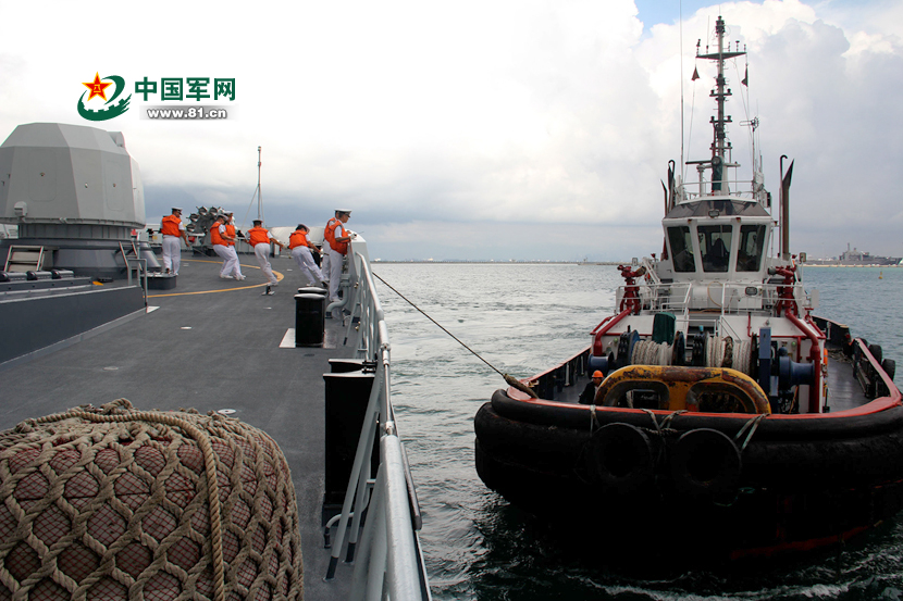玉林舰官兵为拖船带缆。