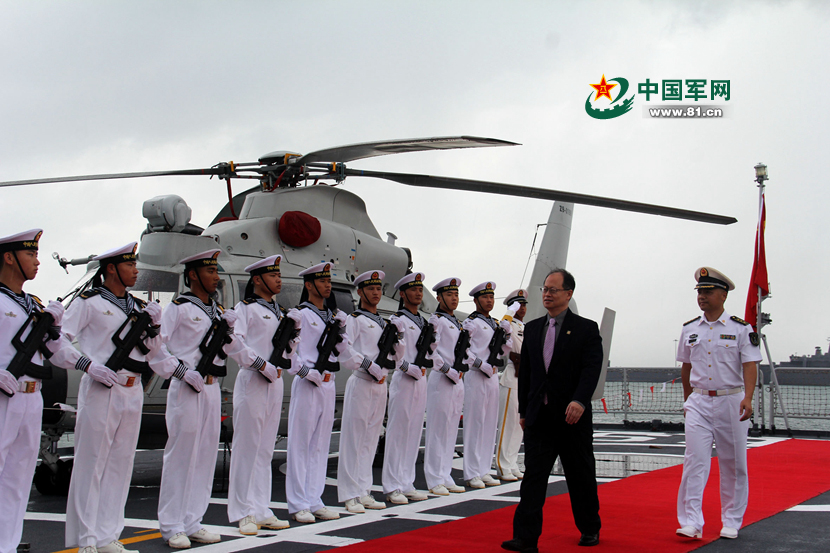 中国驻新加坡大使代办黎宝光检阅玉林舰仪仗队。