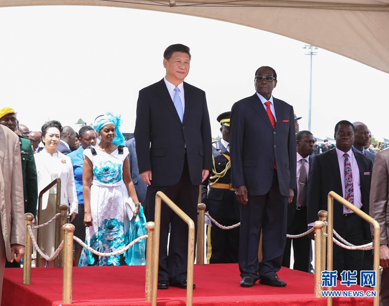 12月1日,中国国家主席习近平乘专机抵达津巴布韦首都哈拉雷,开始对津巴布韦进行国事访问。津巴布韦总统穆加贝在机场举行隆重欢迎仪式。这是习近平在穆加贝陪同下登上检阅台。新华社记者 黄敬文 摄