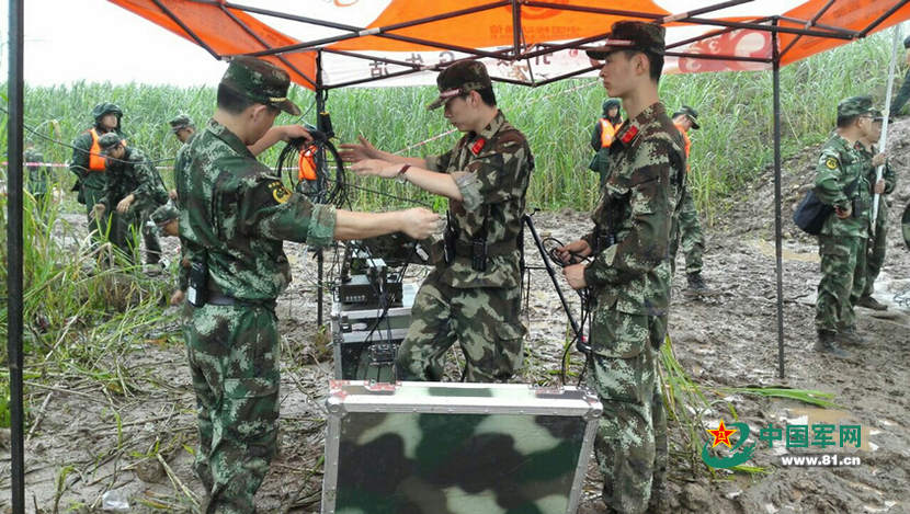 武警湖北总队官兵正在沉船救援现场架设卫星通信设备