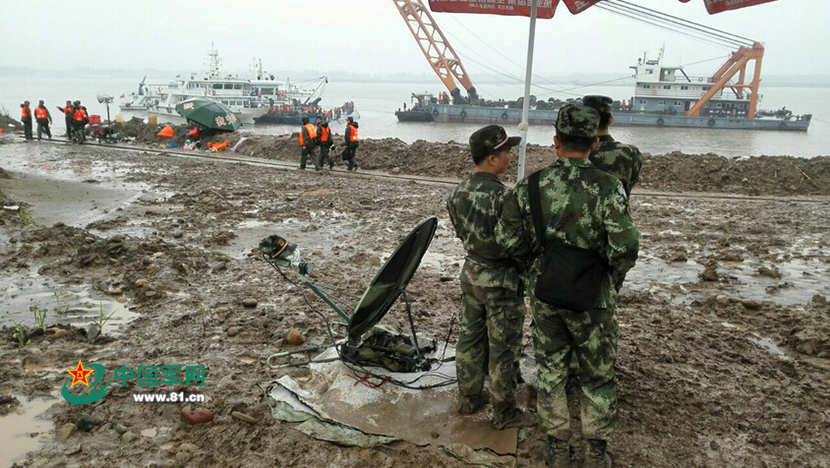 6月3日,武警湖北总队官兵正在“东方之星”沉船救援现场架设卫星通信设备,及时传输现场救援情况。(记者吴敏、通讯员王鹏)