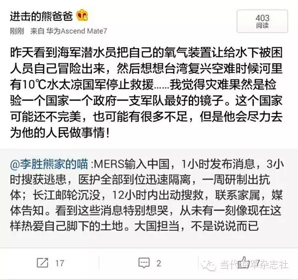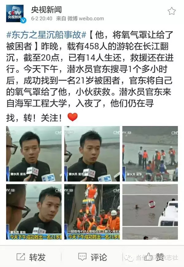 海军潜水员救出遇险群众的消息一经传出,让现场的救援人员精神为之一振,也让关注“东方之星”援救情况的万千网友倍感欣慰,他们纷纷留言,称赞官东是“最帅潜水员”。