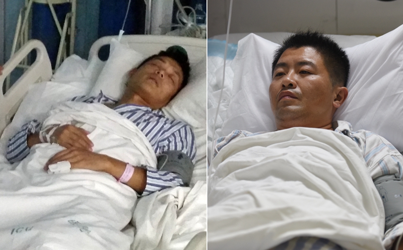 左图:江庚在监利县人民医院接受救治(6月3日摄),右图:张辉在岳阳市第一人民医院接受救治(6月2日摄)。