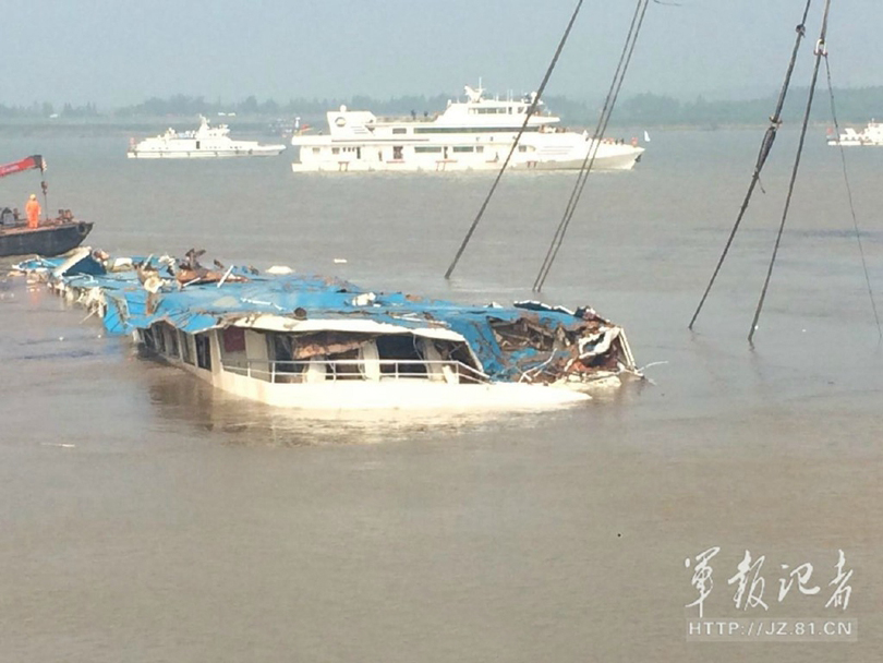 “东方之星”已完全扶正。顶棚已露出水面,船体大部分还在水中。(马威、李开勇)