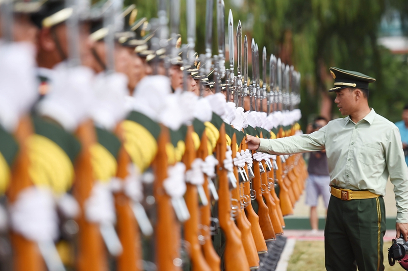 教练在训练中纠正升旗仪式护卫方队队员的动作(8月25日摄)。新华社记者陈晔华摄