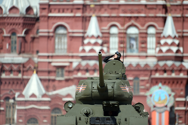 5月9日,在俄罗斯首都莫斯科红场,T-34坦克行进在阅兵式上。