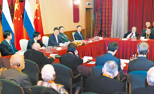 习近平指出,新中国成立之初,在中国人民最需要的时候,近3万名苏联专家先后参与援华建设,涉及工业、农业、能源、交通、教育、科技等几十个领域,同中国人民结下了深厚友谊。从1978年至今,成千上万俄罗斯专家积极参与中国改革开放和现代化建设事业。包括今天在座代表在内的俄罗斯专家们是中俄两国和平的使者,是中国人民的真诚朋友。希望我们共同传承两国人民的深厚友谊,共同开创中俄关系更加美好的明天。