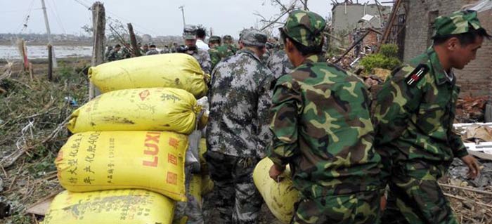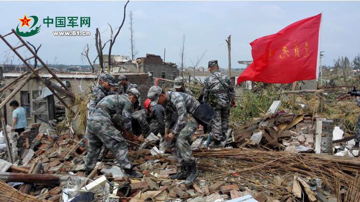 中国军网盐城6月24日电 田亚威、季明摄影报道:24日上午,盐城军分区出动120余名海防官兵和600余名应急分队民兵,奔赴受龙卷风冰雹特大灾害的金沙湖两合村和陈良镇新涂村,全面展开人员搜救、道路清理、群众生产生活物资抢救工作。