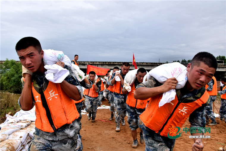雨后的大堤上泥泞难行,阴沉的天气显得格外闷热和潮湿。为了抢在下一轮强降雨到来前完成加固任务,尽管泥巴裹满裤腿,汗水浸透衣背,但官兵们依然奋力喊着战斗口号,将一袋袋沙土运到大堤沿线。