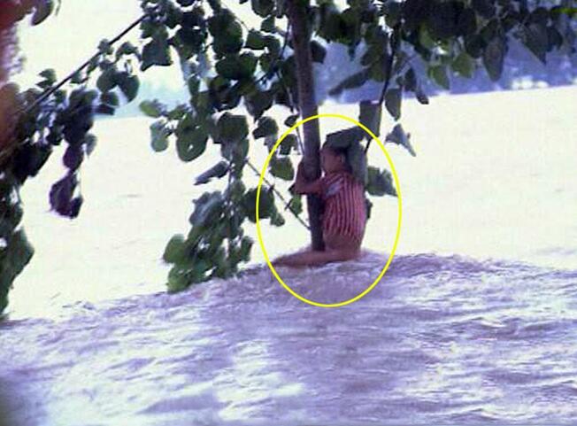 图为簰洲湾决口时小江珊抱住一棵树被官兵营救。(视频资料截图)