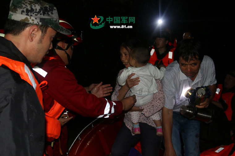 官兵紧急转移被洪水围困的老人小孩。廖振华摄