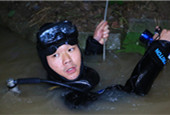 随后,海军工程大学20多名官兵在校务部施国清副部长的带领下,经过2个多小时的艰难跋涉,连夜赴当地探查。初步了解新港闸门两侧的水情后,9时45分至10时25分,潜水员陈伍林8次潜入浑浊的湖水,在新港闸口及周边摸排,探摸水流详情。经与现场的省水利厅专家商讨,初步排除管涌可能,为当地处置险情提供了科学依据。