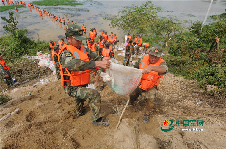 7月10日,武警抚州市支队官兵在鄱阳县莲湖乡莲北大堤4号段处置险情。