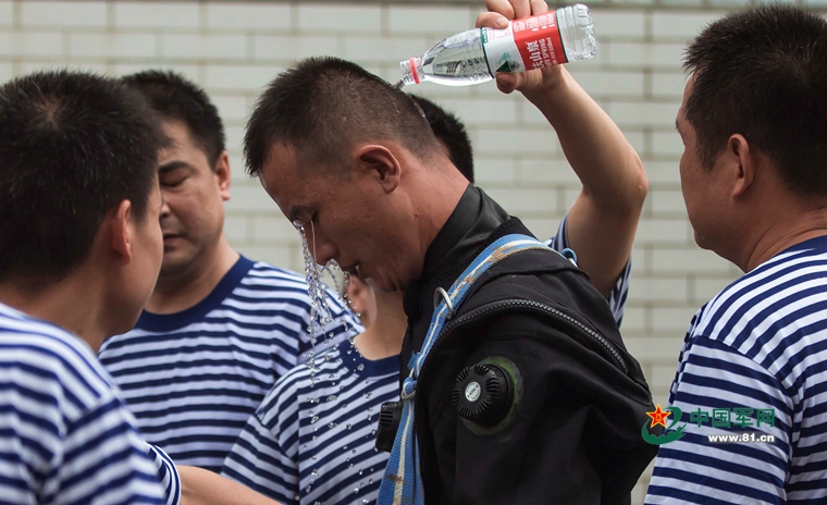 7月13日,海军工程大学潜水员孙学广下水前队友为他降温 。陈礼刚 摄