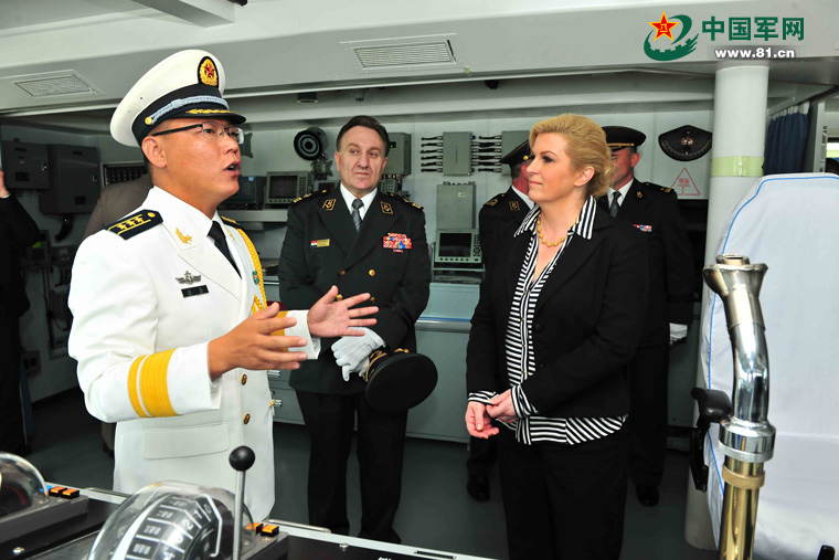 2015年6月4日,克罗地亚总统基塔诺维奇参观了正在克罗地亚共和国斯普利特市进行友好访问的中国海军第十九批护航编队临沂舰。图为临沂舰高克舰长向克总统等介绍临沂舰装备。熊利兵 摄