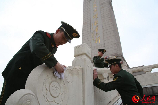 人民网北京2月27日电 为迎接即将到来的全国“两会”,武警天安门支队300余名官兵携带脸盆、抹布等清洁工具走上街头,对广场地区的卫生死角进行了清洗,以实际行动展示广场卫士的良好形象。该部王建华政委介绍,每到大型活动前,支队都会在天安门地区组织大型清洁活动,此次大扫除包括擦拭广场护栏,清洁路灯基座和各类导向指示标牌,清洗纪念碑、国旗区基座的汉白玉栏杆,确保天安门广场以整洁优美的环境迎接盛会的召开。