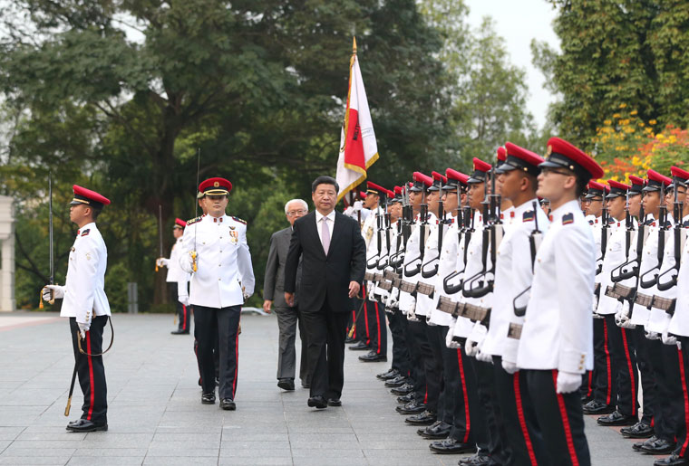 会见前,陈庆炎在总统府广场举行隆重欢迎仪式。这是习近平在陈庆炎陪同下检阅仪仗队。马占成 摄